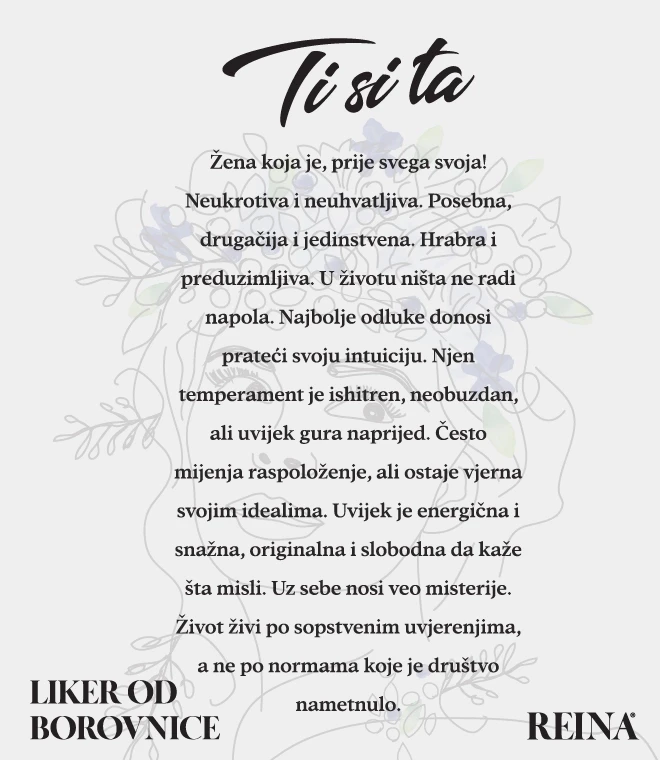 Zavirili smo u najdublje strasti i najskrivenije želje u nama, pronašli posebnu energiju i osjećaj iz stomaka koji je otkrio neponovljivu recepturu. Magični REINA liker od borovnice je bez konzervansa i bilo kakvih drugih vještačkih dodataka.